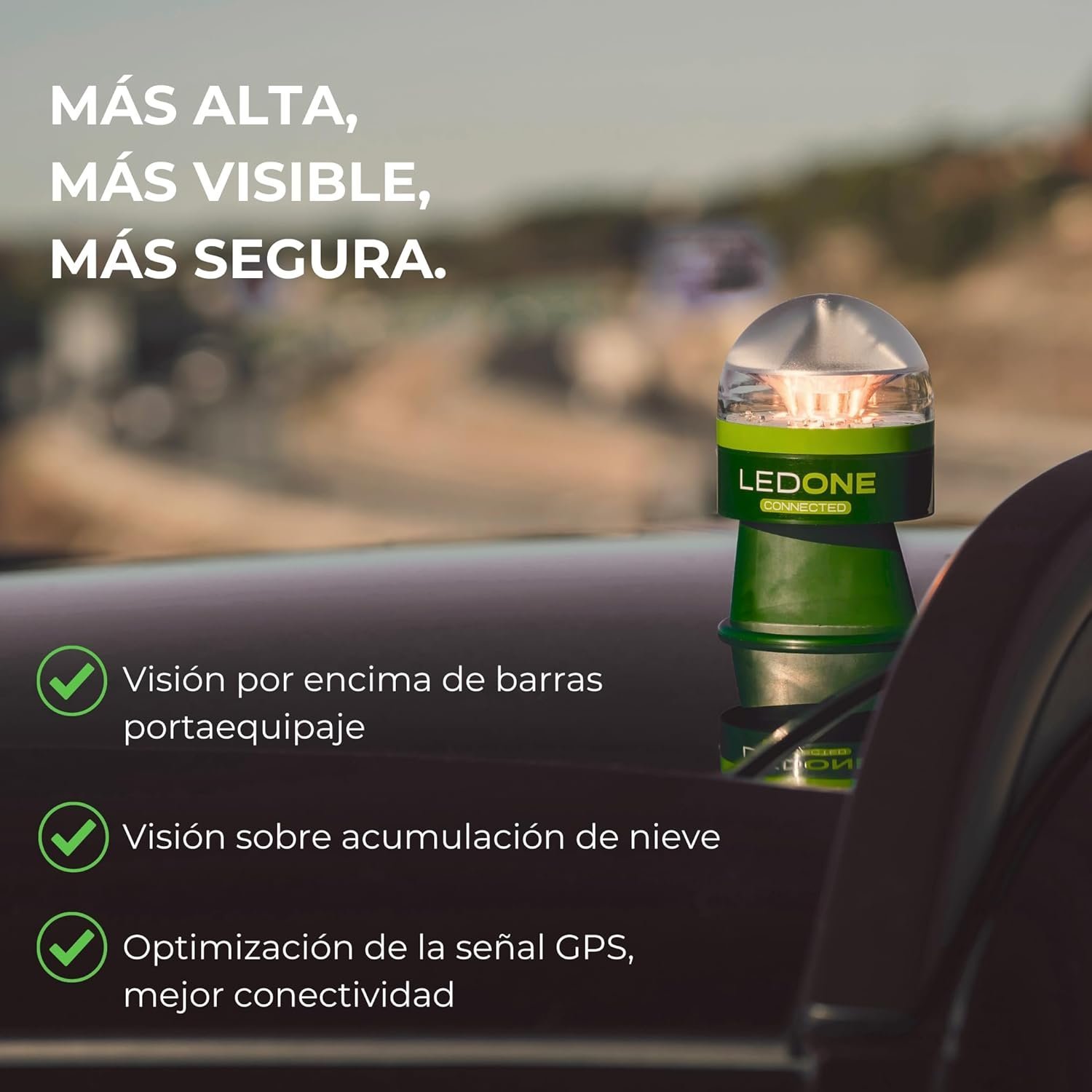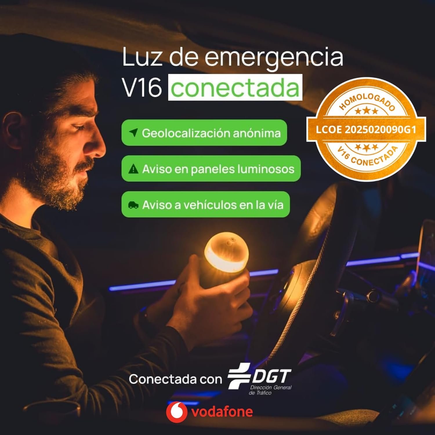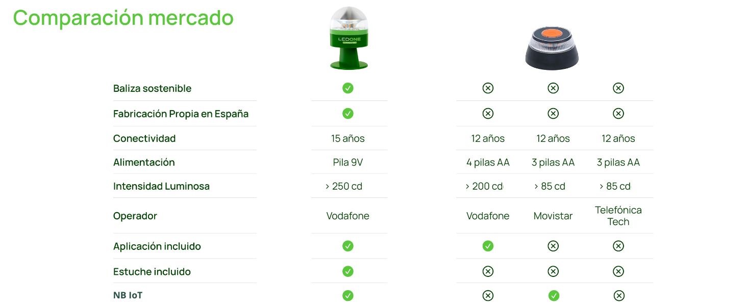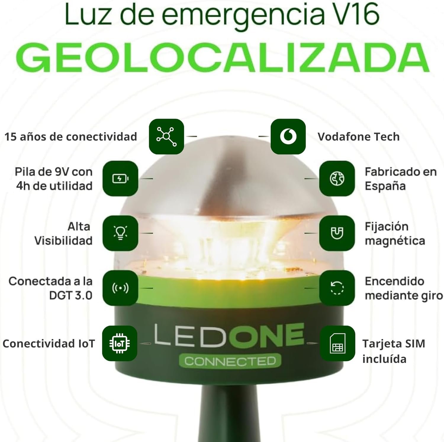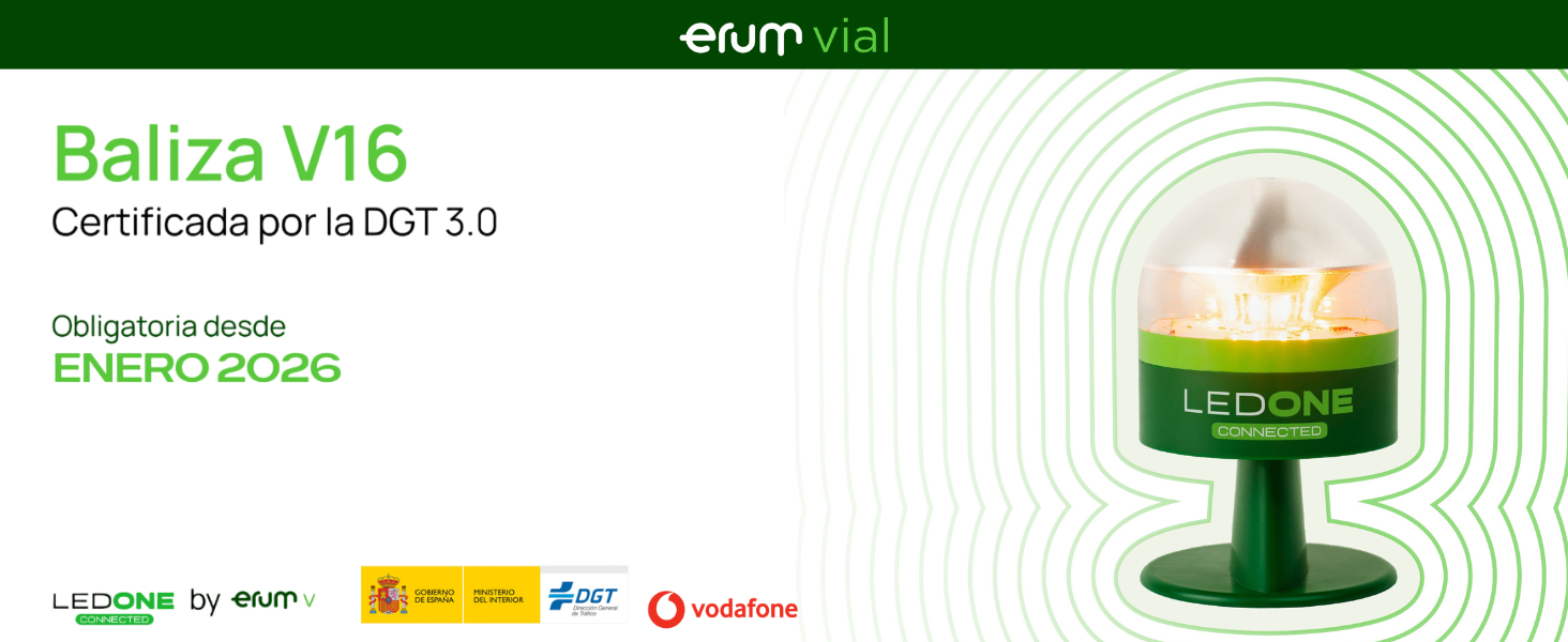 | Características especiales | Conectada, geolocalizada, visibilidad a larga distancia, reemplaza al triángulo |